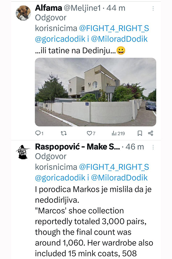 NAGRADNO PITANJE ZA GRAĐANE REPUBLIKE SRPSKE: – koliko devojaka i mladića bi moglo da se školuje na Beogradskom univerzitetu za 2 miliona eura, kolika je vrednost treće vile Gorice Dodik, ćerke Milorada Dodika, koja se nalazi u mestu Krašići, Crna Gora, poručio je beogradski advokat Čedomir Stojković objavivši fotografiju navodne vile Gorice Dodik.