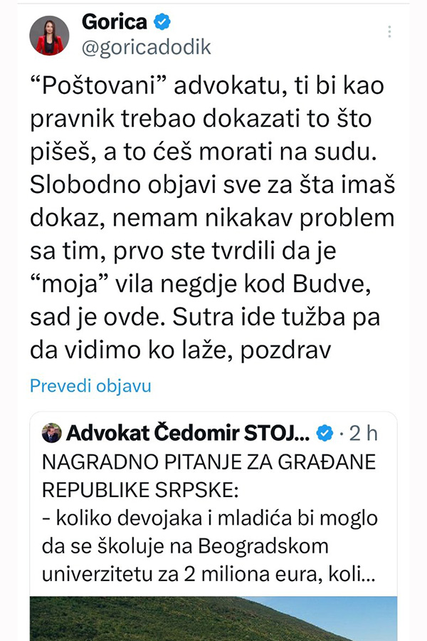“Poštovani” advokatu, ti bi kao pravnik trebao dokazati to što pišeš, a to ćeš morati na sudu. Slobodno objavi sve za šta imaš dokaz, nemam nikakav problem sa tim, prvo ste tvrdili da je “moja” vila negdje kod Budve, sad je ovde. Sutra ide tužba pa da vidimo ko laže, pozdrav, poručila je Gorica Dodik.