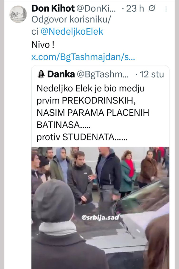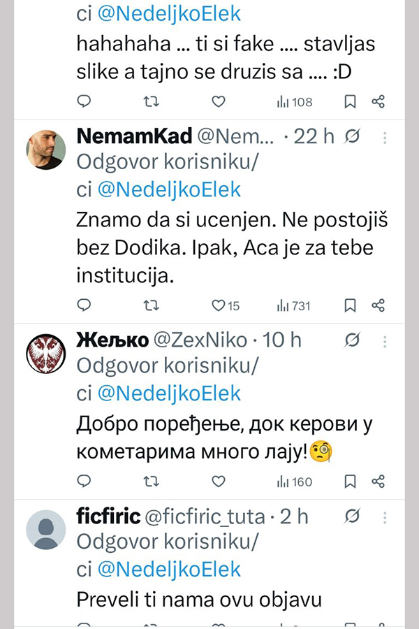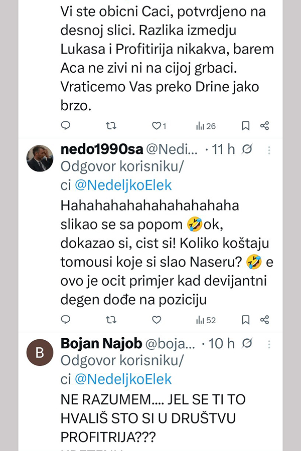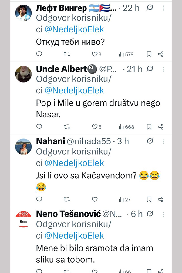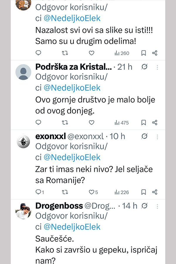 Svi mi kažu da nije moj nivo da komentarišem kokainskog i kockarskog ovisnika, i čovjeka koga su više vozili u gepeku, nego na sjedištu, i nije. Staviću samo ove slike i da svako treba da ostane u svom društvu i na svom nivou, poručio je Elek.