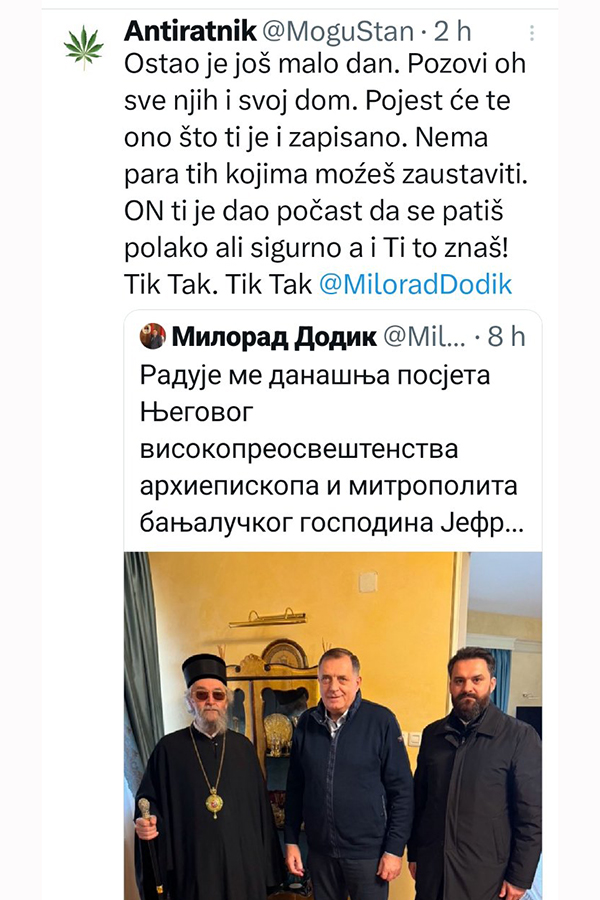Raduje me današnja posjeta Njegovog visokopreosveštenstva arhiepiskopa i mitropolita banjalučkog gospodina Jefrema u mom porodičnom domu uoči predstojećih praznika i najradosnijeg hrišćanskog praznika Božića.