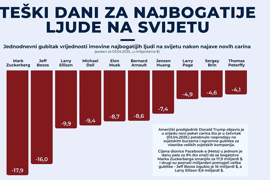 Novi val američkih carina izazvao je velike potrese na svjetskim financijskim tržištima, a među najvećim gubitnicima našli su se najpoznatiji milijarderi.