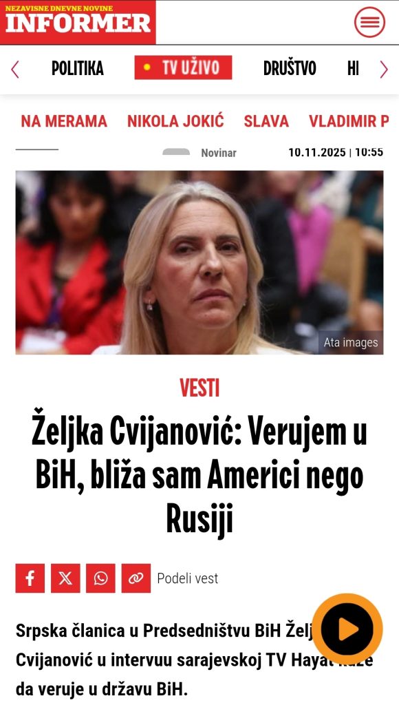 Svjedoče to i naslovi u Vučićevom opskunom tabloidu Informer, čiji je glavni urednik Dragan Vučićević jedva dočekao prenijeti vijest o porukama Željke Cvijanović u sarajevskim medijima.