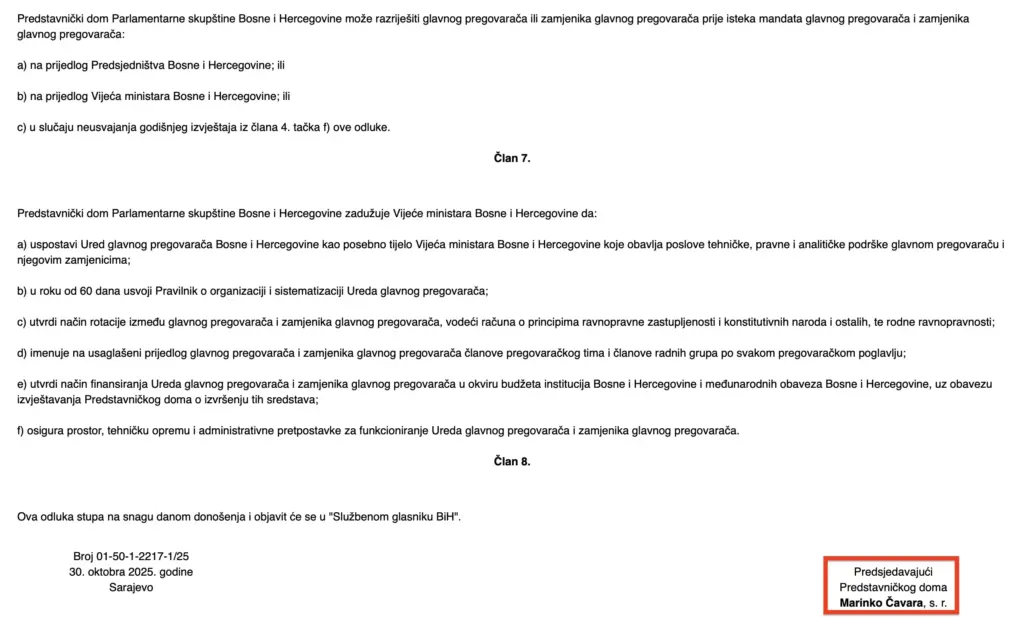 U Službenom glasniku BiH objavljena je Odluka o formiranju Ureda i procedura imenovanja glavnog pregovarača i zamjenika za vodđenje pregovara o pristupanju EU. Potpisao ju je Marinko Čavara, aktuelni predsjedavajući Predstavničkog doma Parlamentarne skupštine BiH, te potpredsjednik HDZBiH.