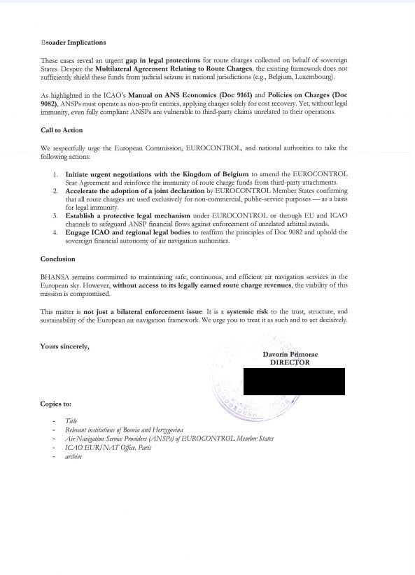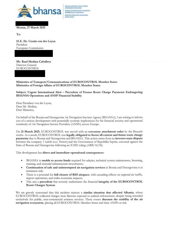 “Duboko smo zabrinuti da ova situacija odražava sličan slučaj koji je pogodio Albaniju, gdje su također sredstva EUROCONTROL-a bila zamrznuta uprkos činjenici da su namijenjena isključivo za javne, nekomercijalne usluge u zračnoj plovidbi”, stoji u pismu BHANSA-e.