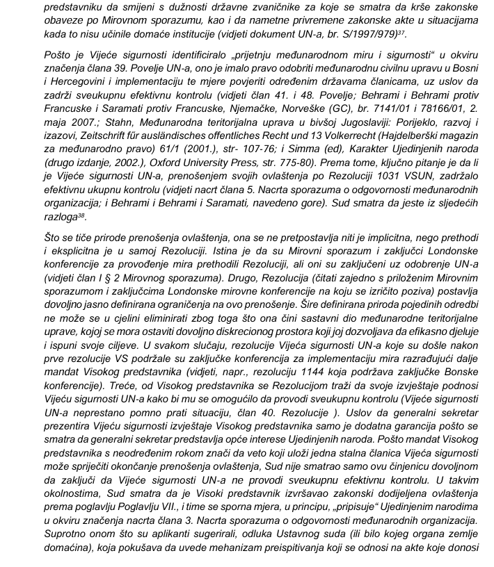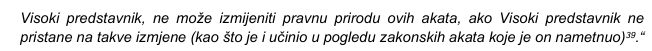 “U pogledu nadležnosti Visokog predstavnika da donosi zakone te nadležnosti Ustavnog suda da odlučuje o saglasnosti tih zakona sa Ustavom Bosne i Hercegovine, Ustavni sud je već ranije izrazio svoj stav da ovlaštenja Visokog predstavnika proizlaze iz Anexa 10 Općeg okvirnog sporazuma za mir u Bosni i Hercegovini, relevantnih rezolucija Vijeća sigurnosti Ujedinjenih naroda i Bonske deklaracije, te da ta ovlaštenja nisu podložna kontroli Ustavnog suda, kao ni vršenje tih ovlaštenja. Međutim, kada visoki predstavnik intervenira u pravni sistem Bosne i Hercegovine, supstituirajući domaće vlasti, tada djeluje kao vlast Bosne i Hercegovine, a zakoni koje donosi su prirode domaćih zakona, te se moraju smatrati zakonima Bosne i Hercegovine…”, podsjetili su na dio odluke Ustavnog suda.