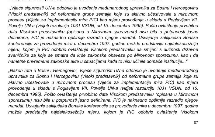 “Dakle, iz navedenih presuda Ustavnog suda Bosne i Hercegovine, donesenih povodom osporavanja, pored ostalog, izmjene Izbornog zakona i izmjene Krivičnog zakona Bosne i Hercegovine, koje je nametnuo isti Visoki predstavnik, Christian Schmidt, Sud je dao odgovor na prva dva pravna pitanja koja su se postavila u toku postupka, a to je da je Christian Schmidt legalno izabran Visoki predstavniki da je isti, po Anexu 10 Općeg okvirnog sporazuma za mir u Bosni i Hercegovini, relevantnim rezolucijama Vijeća sigurnosti UN-a i Bonskoj deklaraciji, imao ovlaštenja da interveniše u pravni sistem Bosne i Hercegovine, pri čemu tada supstituira (zamjenjuje) domaće vlasti, djelujući kao vlast Bosne i Hercegovine i da se zakon koji on donese mora smatrati zakonom Bosne i Hercegovine”, zaključio je Sud Bosne i Hercegovine.