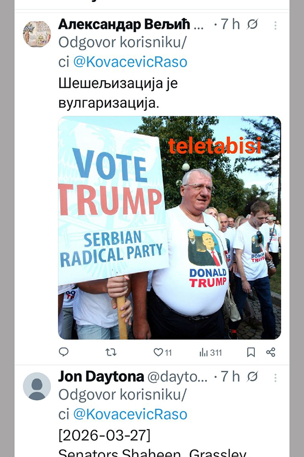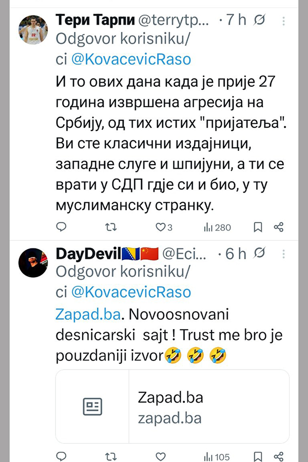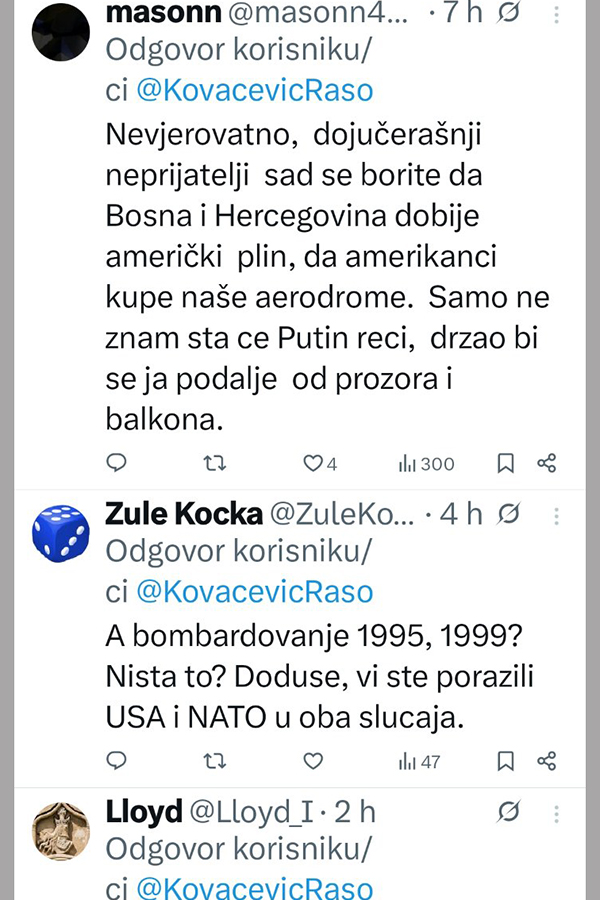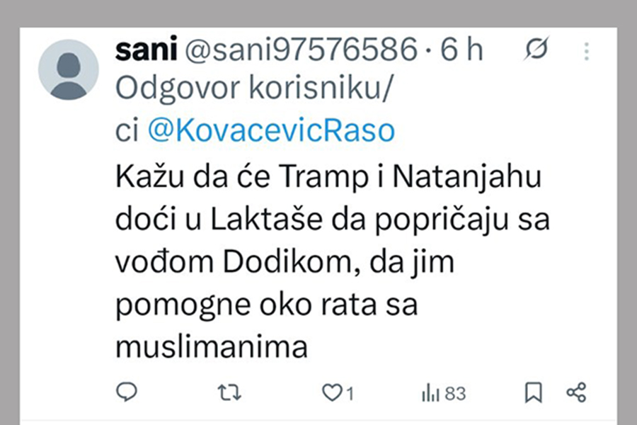 Ne stišavaju se reakcije na društvenim mrežama, nakon istupa Radovana Kovačevića, delegata u Domu naroda Parlamentarne skupštine Bosne i Hercegovine i desne ruke Milorada Dodika.