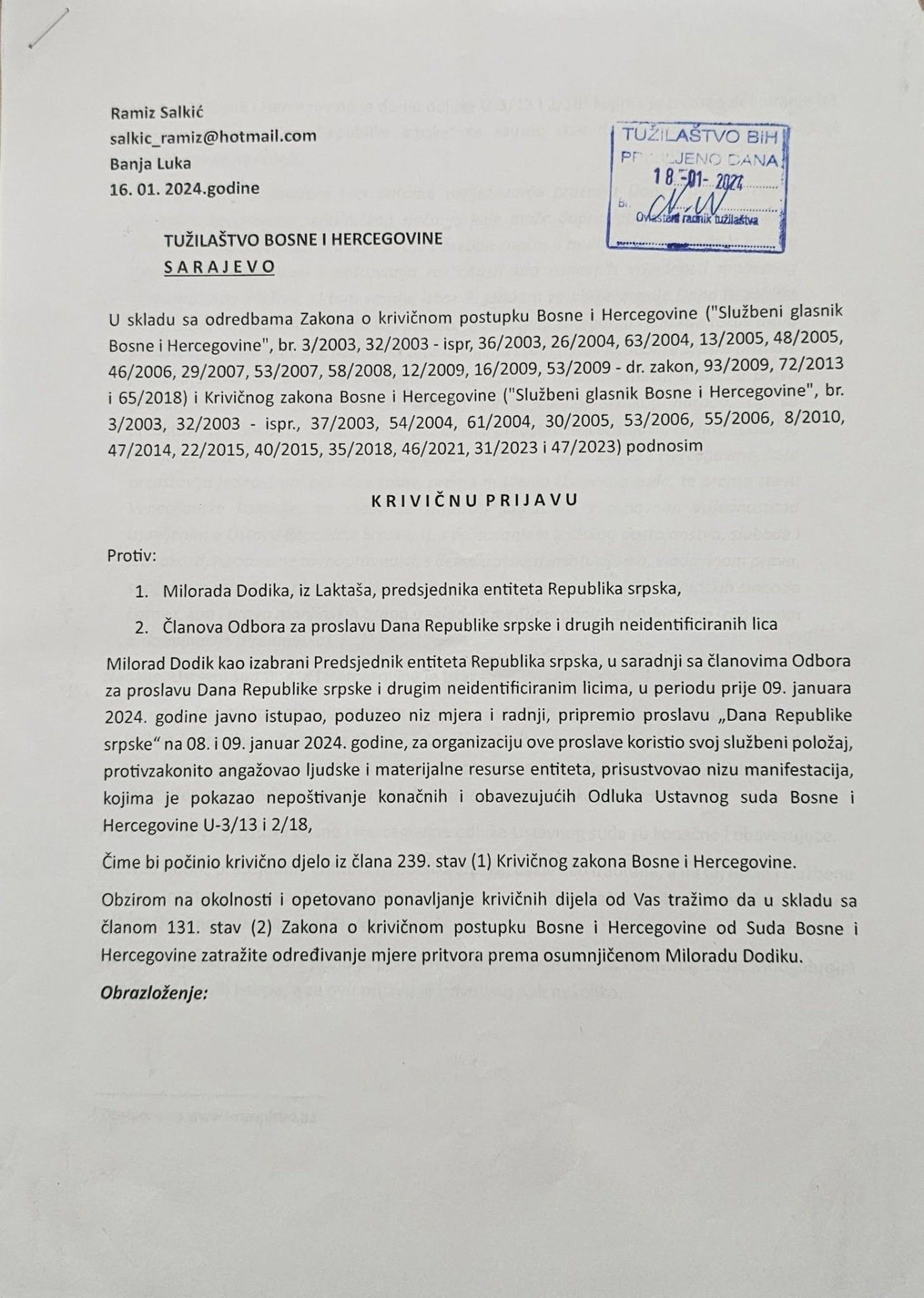 Zbog izostanka adekvatne reakcije Tužilaštva Bosne i Hercegovine po ranije podnesenim krivičnim prijavama protiv organizatora obilježavanja neustavnog i nezakonitog 9. januara kao dana entiteta RS, NSRS nastavlja s neustavnim djelovanjem, pozivajući i druge da se uključe u ove aktivnosti. Ustavni sud Bosne i Hercegovine jasno je u svojoj odluci naveo da se 9. januar ne može obilježavati kao dan entiteta RS – podsjeća zastupnik SDA u NSRS-u Ramiz Salkić.