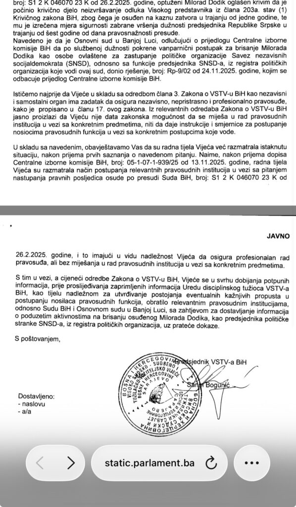 Od njih je VSTV tražio dostavljanje informacija o poduzetim aktivnostima na brisanju osuđenog Milorada Dodika, kao predsjednika političke stranke SNSD, iz registra političkih organizacija, uz prateće dokaze.