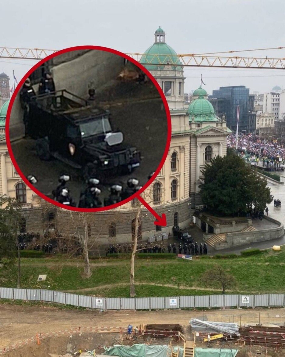 Na fotografiji se vidi policijska brigada na bočnoj strani Skupštine Srbije i policijsko vozilo, a na njegovoj haubi nešto što bi mogao biti uređaj za proizvodnju zvučnih talasa.